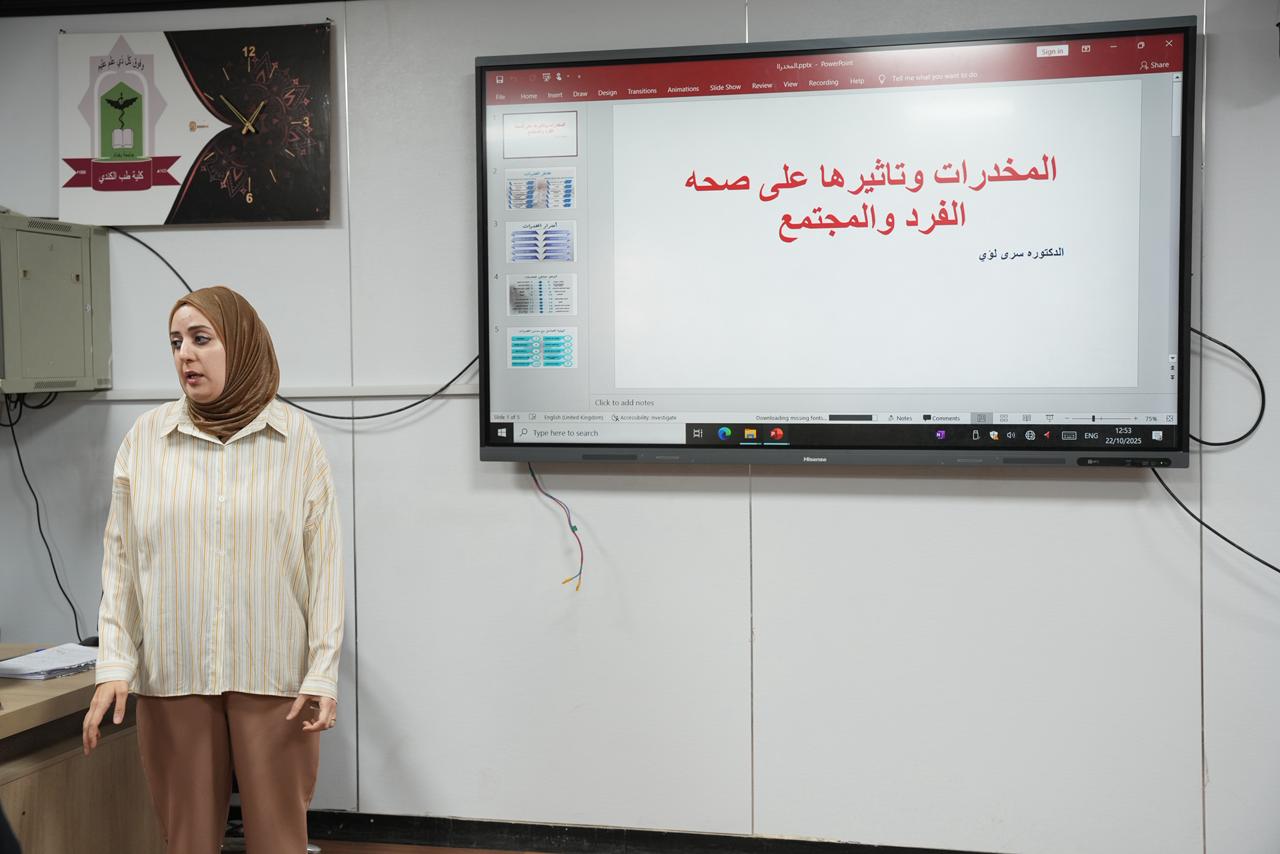 نظّمت وحدة الإرشاد النفسي والتوجيه التربوي في كلية طب الكندي – جامعة بغداد ندوة توعوية بعنوان “المخدرات وأضرارها على الفرد والمجتمع”، خصصت لطلبة المرحلة الخامسة في الكلية.